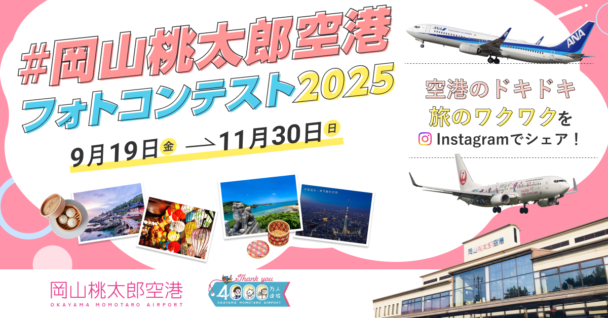 ぜひこの機会に、飛行機や空港施設、就航先での旅の風景など、岡山桃太郎空港にまつわる一枚をご応募ください。